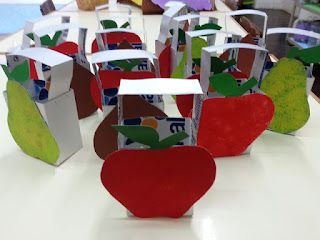 Os nossos cestinhos foram feitos com caixas de leite e caixas de cereias: